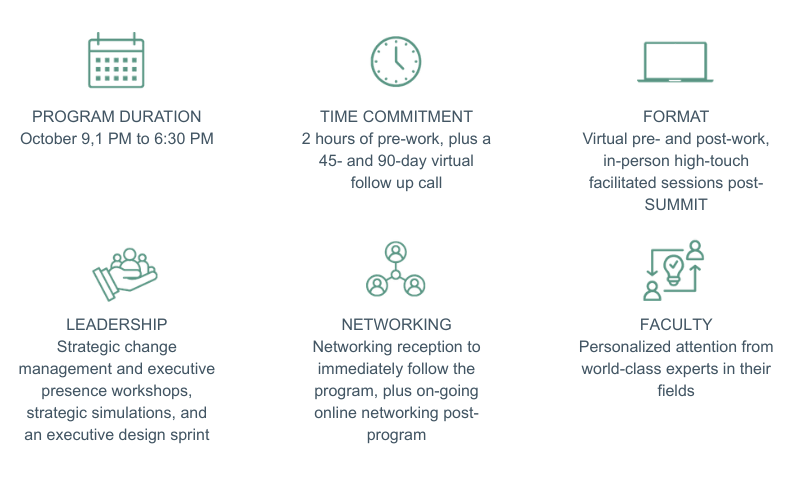 A high-impact, half-day experience for leaders preparing to step into senior or executive roles. Participants navigate realistic strategic scenarios, learn practical change frameworks, and work in curated peer advisory groups to convert insights into a 90-day action plan. The experience will conclude with a networking reception.